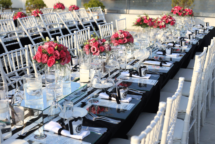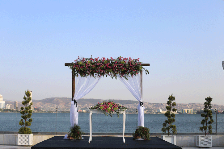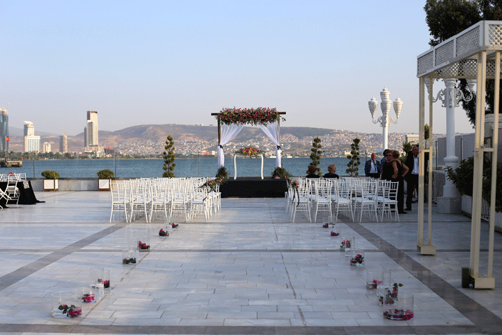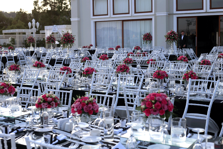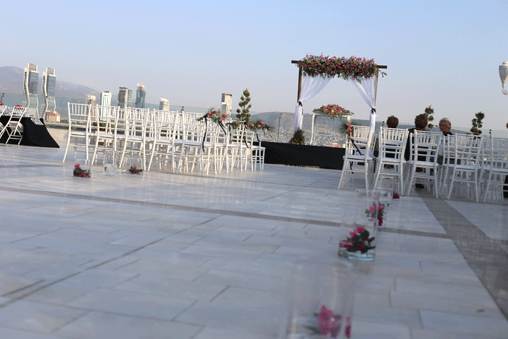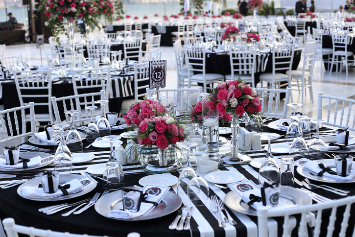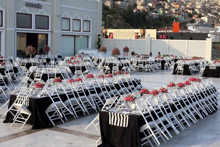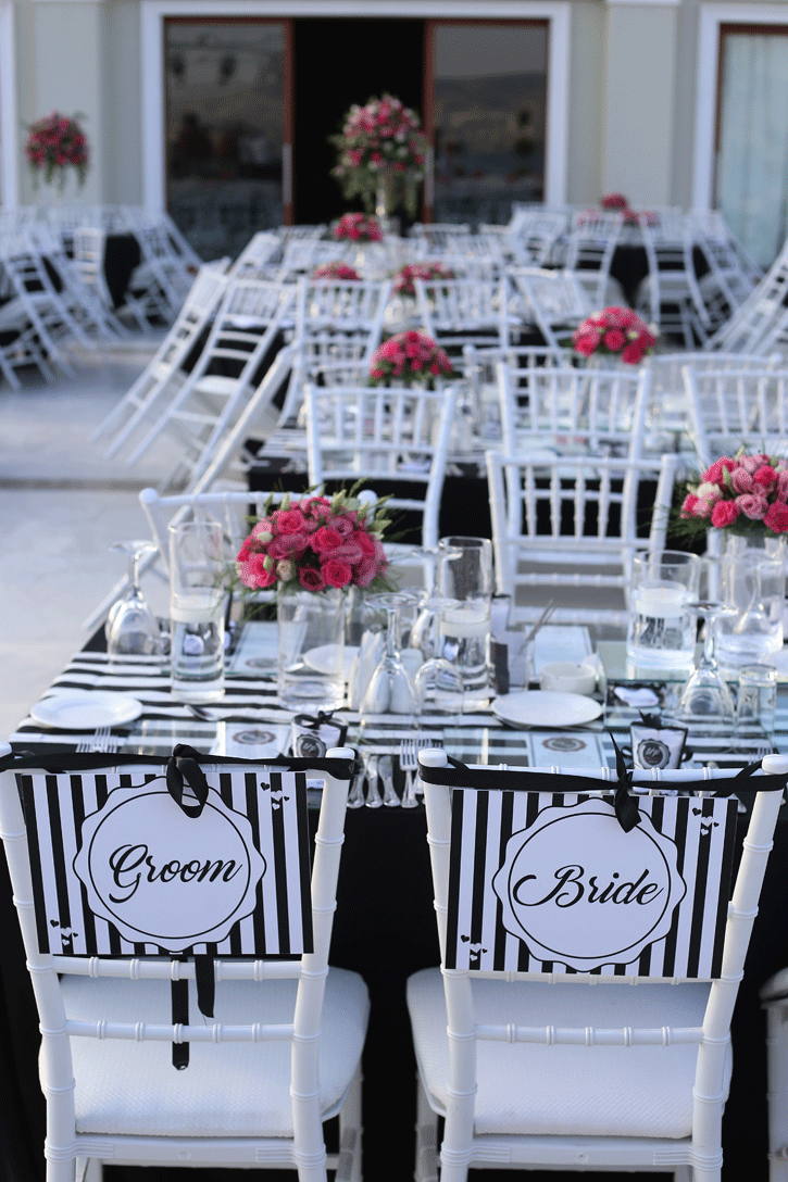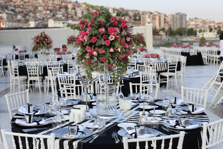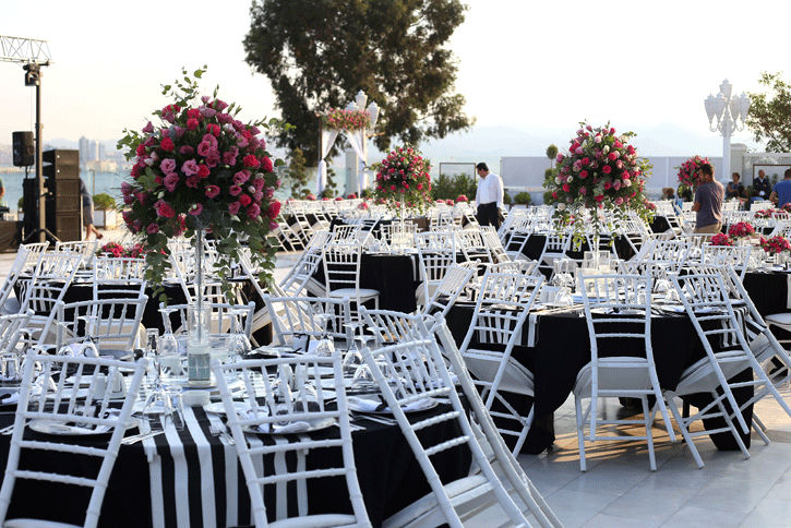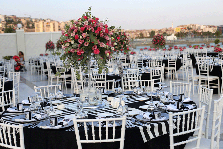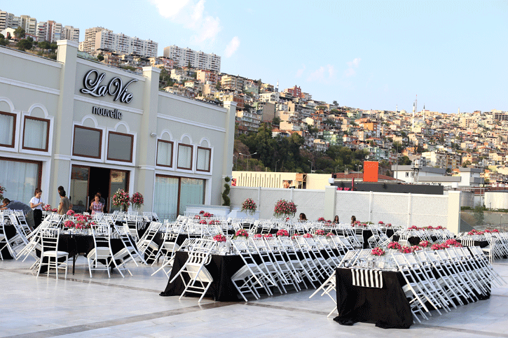 İzmir körfezi kıyısında, şehrin ışıkları manzarasında düğün yapılabilecek şık bir mekan olan La Vie Nouvelle 'in beyaz zemin altyapısını siyah beyaz detaylarla hareketlendirdiğimiz hem spor, hem de şık bir düğün organizasyonu... Siyah ve beyaz işin içine girdiğinde fuşya çiçeklerin uyumuna da bayılıyoruz. Klasiğin dışında tercih edilebilecek konseptlerden biri.