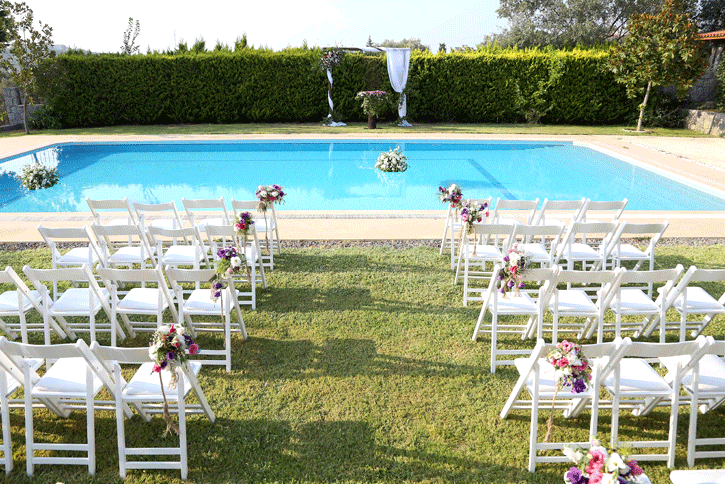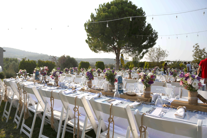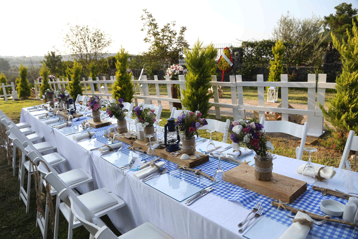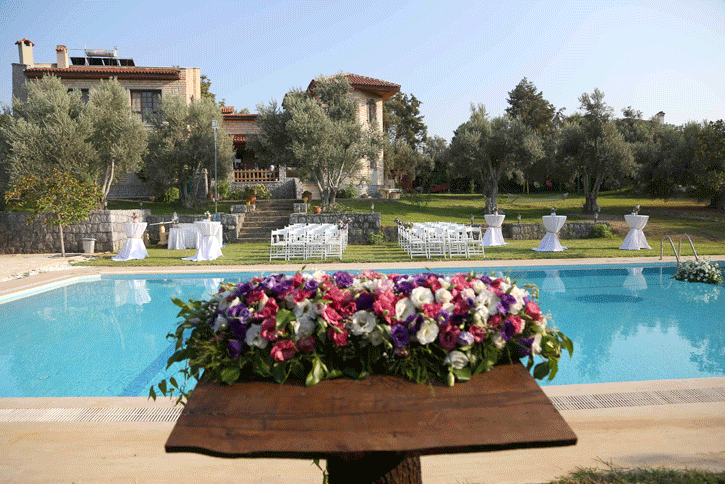 2015 yılında Zeytinalanı 'ndaki bir villa bahçesinde yaptığımız düğün organizasyonuna misafir olarak katılan çiftimiz, 1 sene sonra aynı bahçede evlenme hayallerini gerçekleştirme fırsatı buldular. Havuzbaşında kıyılan nikahın ardından kır bahçesinde dikdörtgen masa düzenindeki yemek alanına alınan davetliler, grek konseptiyle hazırlanmış rustik temalı masalar ile karşılaştılar. Müziğinden dekorasyonuna aydınlatmasından yemeklerine kadar her detayda grek düğünü konsepti işlenen keyifli bir düğün organizasyonu oldu.